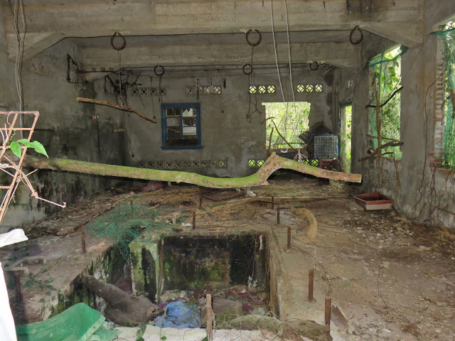 沿途發現不少廢棄建築物,直行至溪流處,一座懸空的廁所在溪流涵管上方,對面靠山壁的斜坡道直行至盡頭為捲揚機房,建築物外觀被綠色植物緊緊包覆,裡頭的機電設備和捲揚機被拆卸一空,由建築物門口的台車道往前直線延伸,盡頭處便是坑口,很可惜已經崩塌,坑口地面全是鬆軟的泥土。